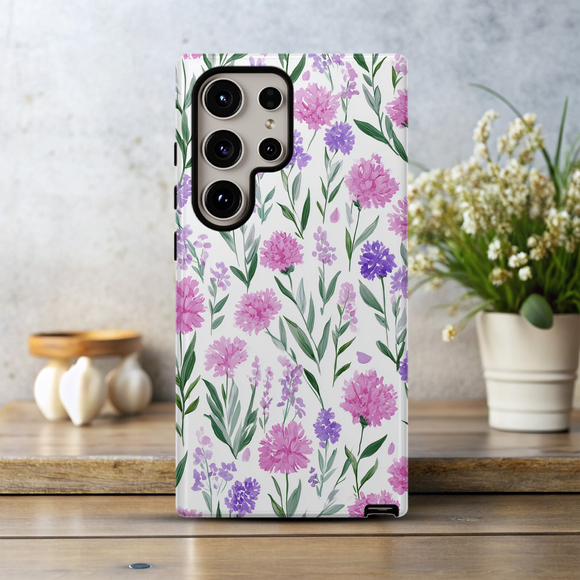 Fresh, feminine, and full of charm – this pink & purple wildflower phone case is the perfect blend of art and protection. With hand-painted watercolor-style blooms in vibrant pinks and purples, paired with lush green stems on a crisp white background, it’s a design that feels both modern and timeless.