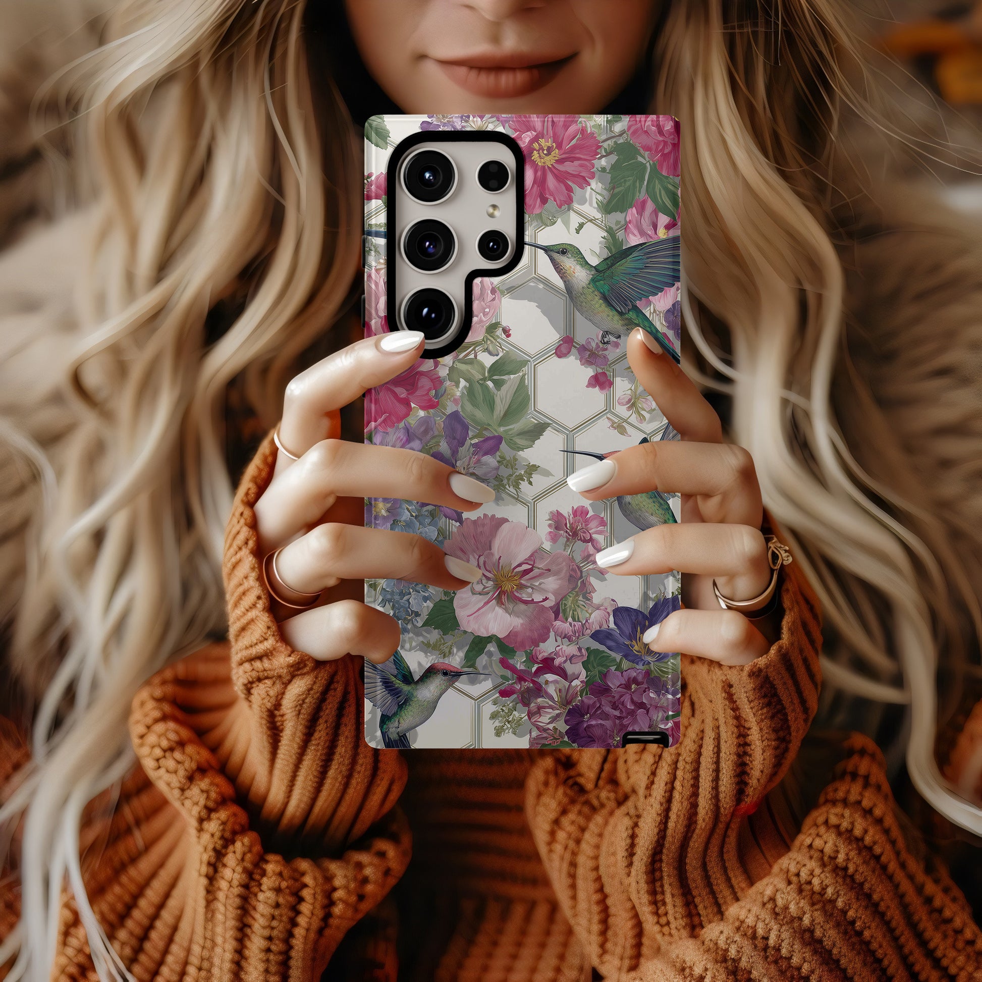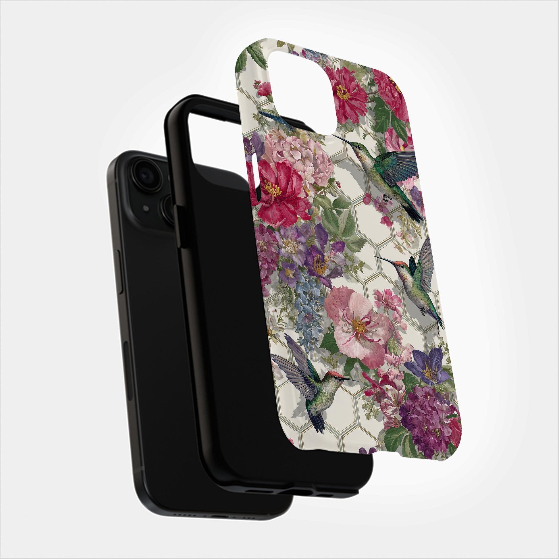 The Hummingbird Garden Bloom Phone Case blends elegant florals with vibrant hummingbirds against a soft geometric hex backdrop, creating a timeless yet eye-catching design. Inspired by vintage botanical illustrations, this case feels luxurious, lively, and effortlessly stylish β€” perfect for anyone who loves nature, color, and individuality.